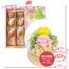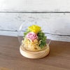 ガラスドームと花束デザートのセットです。ドーム入りのアレンジは保護性が高く、美しさが長持ちします。花束デザートは「京せんべい」にクリームとドライフルーツ(ストロベリー・マンゴー・キウイ)をのせ、職人が一つひとつ花束形に仕上げた可愛いお菓子です。
