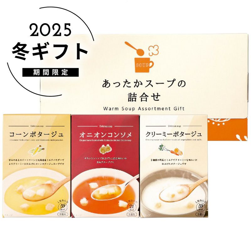 内容コーンポタージュ(15g×3袋)・クリーミーポタージュ(15g×3袋)・オニオンコンソメ(7g×3袋)各1個