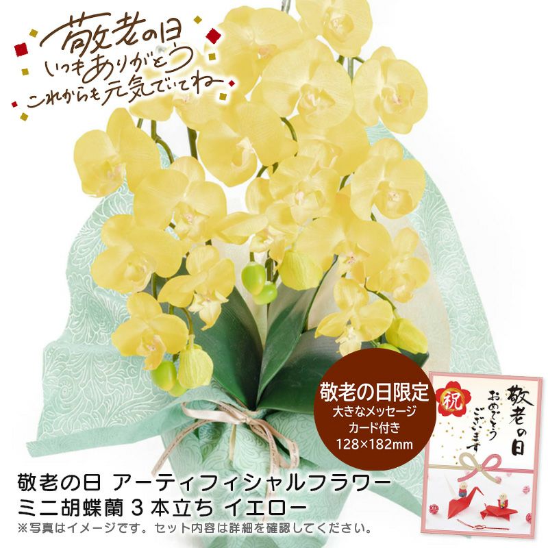 <敬老の日 アーティフィシャルフラワー ミニ胡蝶蘭3本立ち イエローの特長>