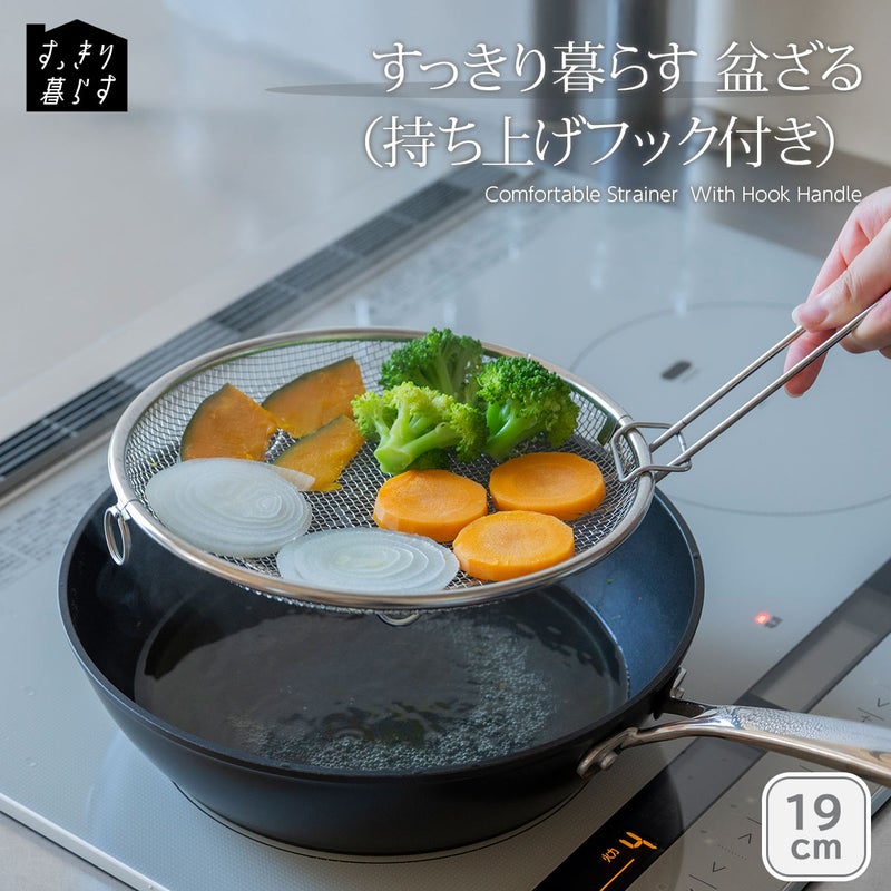 使う時だけ装着!便利な持ち上げフック付きで、直接触れずにザルを移動できる新発想。使い方いろいろ便利な盆ざるは、【ざる】【食器】【湯切り】としてお使いいただけます。取っ手がないから、鍋やフライパンの容量をめいっぱい使える。揚げ物の油切りにも使え、そのままお皿に移動して食器としてもOK。お皿の中でもおさまりが良いのも魅力。両側にリング付きなので、しっかり振って水切りしたい時も安定。ステンレス製だから食器洗いで丸洗いOK!吊り下げ収納も可能です。