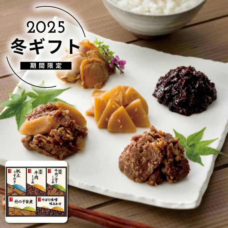 内容減塩牛肉しぐれ50g・減塩牛肉ごぼうしぐれ50g・竹の子旨煮50g・帆立うすだき40g・そぼろ味噌味あわせ90g各1個