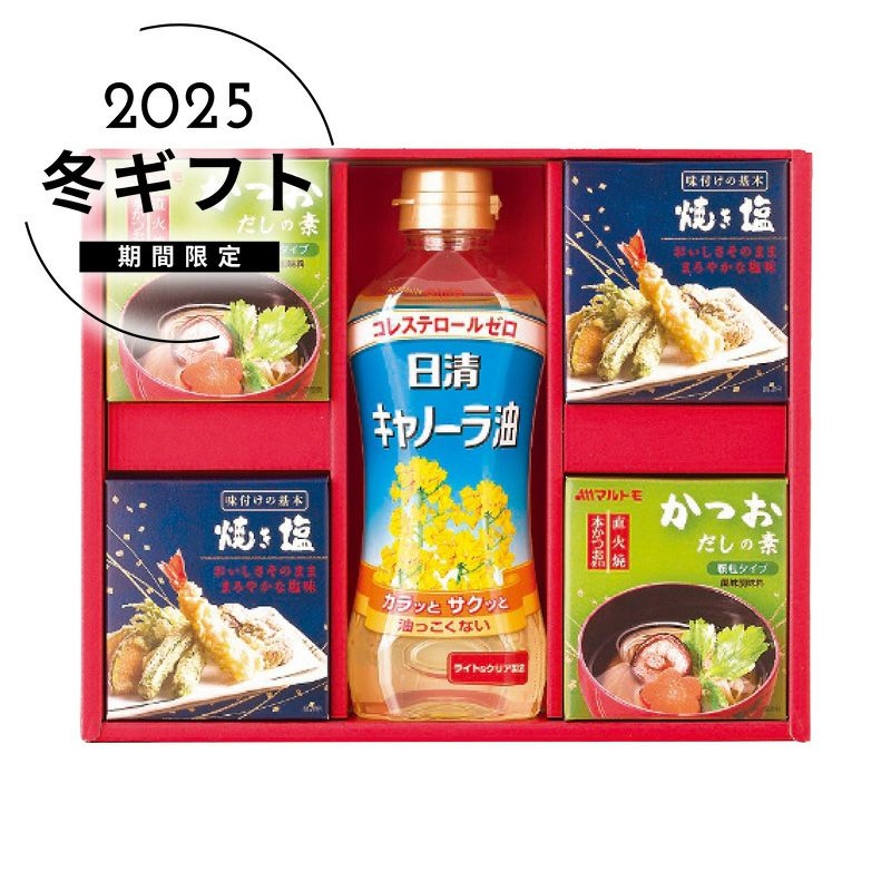 内容日清キャノーラ油350g×1本・マルトモかつおだしの素(4g×6袋)・焼き塩(20g×2袋)各2箱