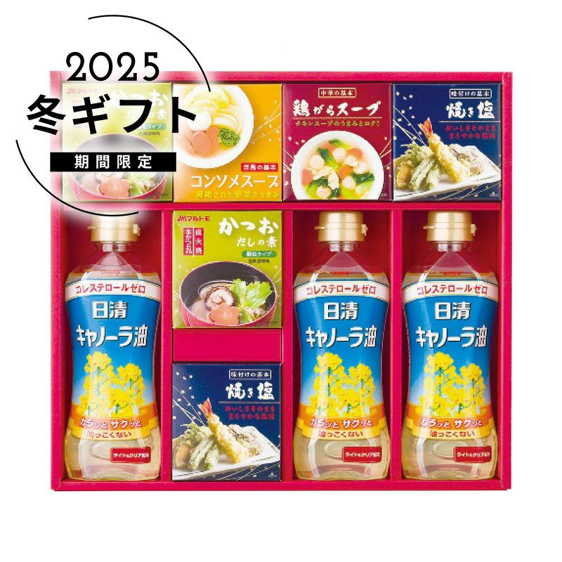 内容日清キャノーラ油350g×3本・マルトモかつおだしの素(4g×6袋)・焼き塩(20g×2袋)各2箱・鶏がらスープ(20g×2袋)・コンソメスープ(20g×2袋)各1箱