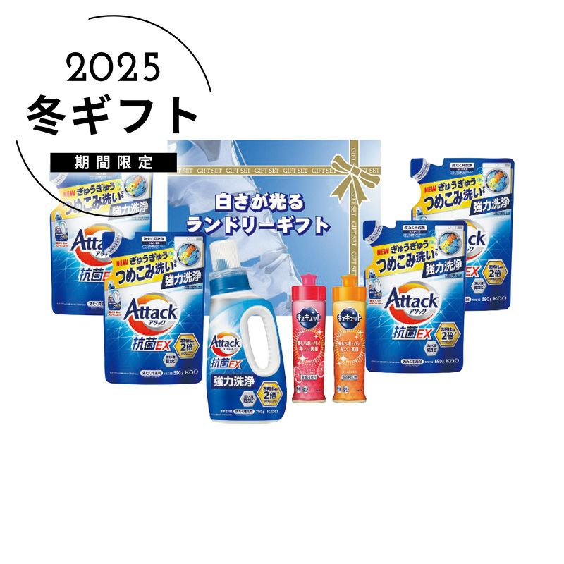内容750g花王アタック抗菌EX・220ml花王キュキュット(オレンジ・ピンクグレープフルーツ)各1本・590g花王アタック抗菌EX(詰替用)4個
